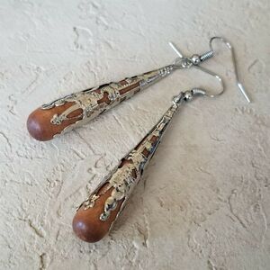 Handcrafted Victorian Style Brown Wood Silver Filigree Teardrop Earrings