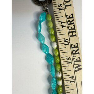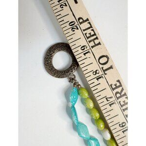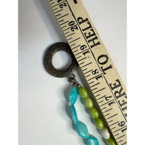 This vintage necklace features vibrant turquoise and green beads enhanced with a textured metal ring closure. A timeless accessory for adding elegance.