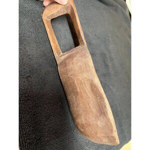 This handcrafted wooden scoop exudes rustic charm, highlighted by its organic shape and smooth finish. Ideal for display or functional use in traditional settings, its sturdy handle provides a comfortable grip. The vintage appeal is enhanced by the natural wood grain, making it a distinctive addition to any collection.