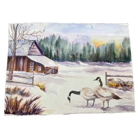 This exquisite watercolor painting captures the serene beauty of a winter landscape, featuring geese and a rustic cabin. The delicate brushwork and soft color palette bring the scene to life, making it an ideal piece for art collectors and nature enthusiasts. Its calming composition offers a touch of tranquility to any space.