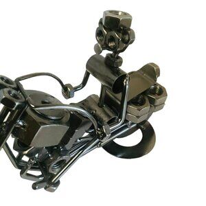 This handcrafted metal motorcycle sculpture is a unique piece of art, perfect for home or office decor. Made from nuts, bolts, and screws, it showcases intricate detailing.
