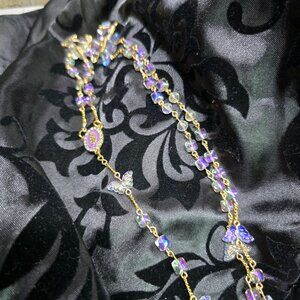 This handcrafted whimsical rosary features iridescent butterfly beads in purple and gold. Perfect for Christmas, it adds a touch of elegance to any occasion. Ideal for those who appreciate unique and artistic designs.