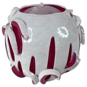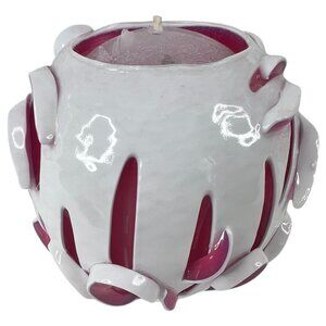 Handcrafted White & Pink Ribbon Candle Sculpted Floral Design Round 3.5” Tall