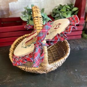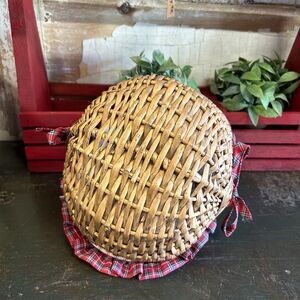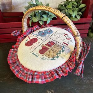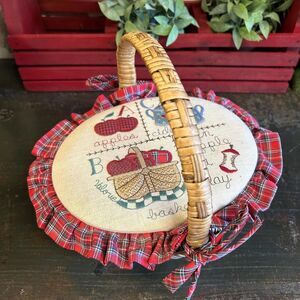 The lid is embroidered with charming apple and cider-related motifs, surrounded by a rustic red and blue plaid ruffle that ties neatly to the handle with matching bows. This basket isnt just for looks—its hollow interior provides a clever and quaint storage solution. Use it as a sewing or craft basket, a place to store small items in a living room, or as a charming display piece to add a touch of cottagecore or primitive style to any space.
