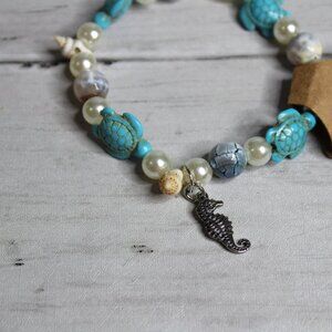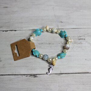 This handcrafted bracelet has a beach theme with seashells, faux pearls, turquoise blue turtles and a silver tone seahorse charm. It is beautiful quality and is brand new.