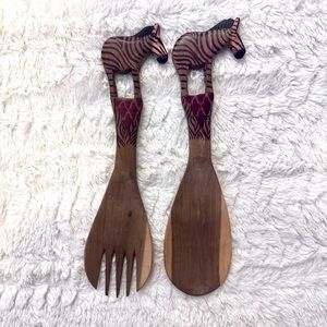 Set of wooden utensils featuring animal designs. Includes giraffe, zebra, and elephant motifs. Perfect for adding a unique touch to your kitchen. For the most part these are in great condition. See photos for condition: the elephant has a chip. They still work great and are a beautiful addition to a kitchen. Collectors
