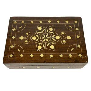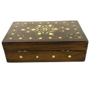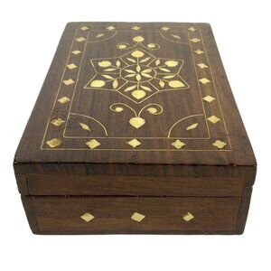 Handcrafted Wooden Jewelry Stash Box Inlaid Design Rectangular Stars Boho
