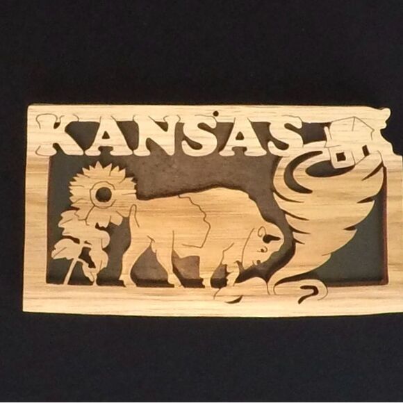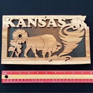 Enhance your space with this Kansas-themed wooden wall art. Featuring natural wood tones, it adds a rustic charm to any room.