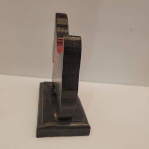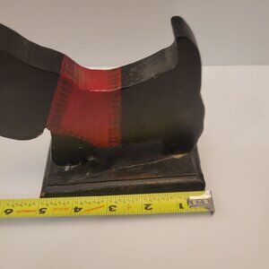 This handcrafted Scottie dog figurine is a charming addition to any collection. Made from wood, it features striking red accents, adding a pop of color to its silhouette. Its size is ideal for display on shelves or desks, serving as an eye-catching piece.