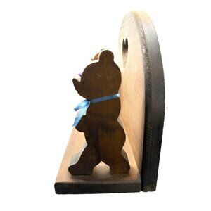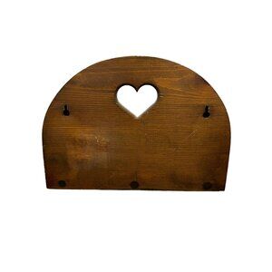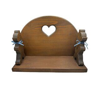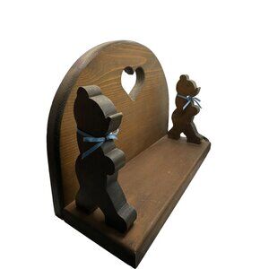 Delightful handcrafted wooden shelf featuring heart cutout and charming bear figures with blue ribbons. Ideal for nurseries, bedrooms, or rustic décor. Approx. size 12" L x 8.5" H x 4.75" D.