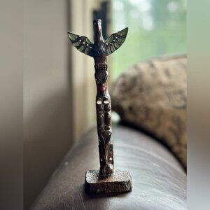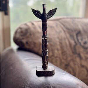 "Enhance your home with this handcrafted wooden totem pole. Featuring intricate designs in brown and red, this piece adds a touch of cultural artistry to any space.
