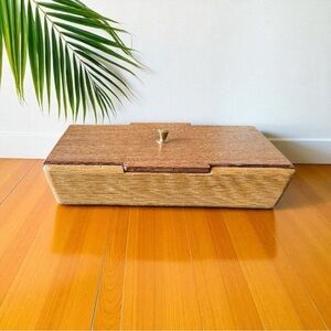 Beautifully handcrafted and compact, this wooden box features a rich wood grain, notched lid design, and a small brass knob. Perfect for holding rings, jewelry, keepsakes, or small office items like paperclips or stamps. The bottom is stamped with an unknown artist’s mark (see last photo), making it a unique and collectible piece.