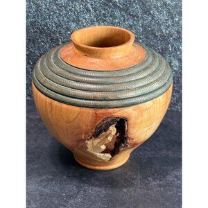 Handcrafted Wooden Vase With Carved Detailing & Natural Knot Design Signed SJ