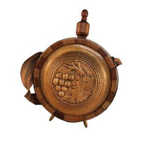 This unique handcrafted wooden decorative flask features brass accents and a colorful woven strap for authenticity and charm. Showcasing a beautifully detailed grape motif carving on both sides, it captures a folk art aesthetic that delights the eye. Designed with practicality in mind, the flask stands on four sturdy brass legs and includes a stopper. The woven strap enhances ease of handling and adds a bright element to this vintage collectible. Its craftsmanship and functional decorative appeal make this an excellent display piece or conversation starter.