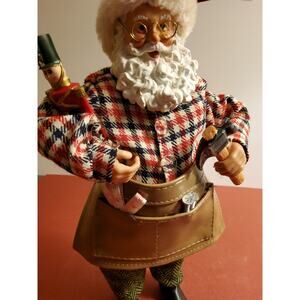 This charming Santa figurine portrays Santa the Toymaker, dressed in a red and black plaid flannel shirt, green herringbone trousers, and a tan faux-leather tool apron filled with miniature nails, a hammer, and a toy soldier.