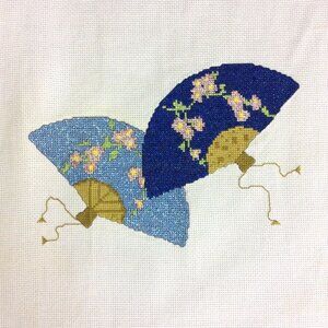 Delicate cross-stitch artwork transforms a world map into an elegant Japanese fan design, meticulously stitched on fine white canvas. Intricate details capture continents in blue, navy, and golden hues, with subtle floral accents enhancing the geographical imagery.
