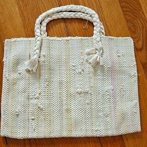 Stylish and unique, this handcrafted tote bag features a beautiful yellow, cream, and pink design.