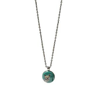 This handcrafted pendant necklace features a Yorkshire Terrier portrait set under a glass dome with a vibrant turquoise background. The silver-toned setting and chain offer a classic, versatile design for dog lovers and pet owners.