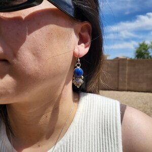The necklace features a stunning array of deep blue lapis lazuli stones, each stone carefully set to highlight its natural flecks of gold and rich color. The matching earrings perfectly complement the necklace, making this set a statement of elegance and sophistication. The sterling silver setting enhances the vibrant lapis stones, giving this jewelry set a polished, refined look that’s perfect for any occasion.