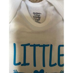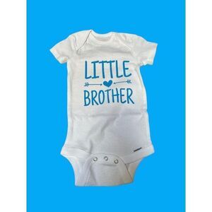 Handcrafted Little Brother onesie, white Gerber onesie with little brother in blue writing. Size 6-9 months. Available in 0-3 and 3-6 just message me if you need these sizes. Haven’t figured out how to add variations
