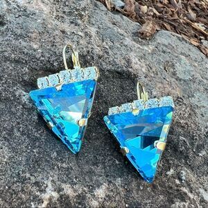 Beautiful gold leverback pierced statement earrings. My husband and I make jewelry using genuine Swarovski crystals. This pair is about 1 inch on each side. All items are new and much prettier in person than pictures. Proceeds used to help our 5-yr-old granddaughter Lila May in her fight against cancer, but she lost her battle. Now she is dancing with the angels. A percentage of profit will go to Neuroblastoma charities. 273