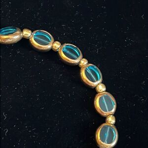 Handcrafted gold tone blue and gold bead stretch bracelet