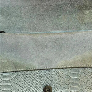 Handmade suede leather satchel handbag with gunmetal hardware 3 compartment zip closure at center suede lining open pocket under flap snap closure at top minor discoloration hight 7” width 10.5” depth 1.25” strap drop 21”