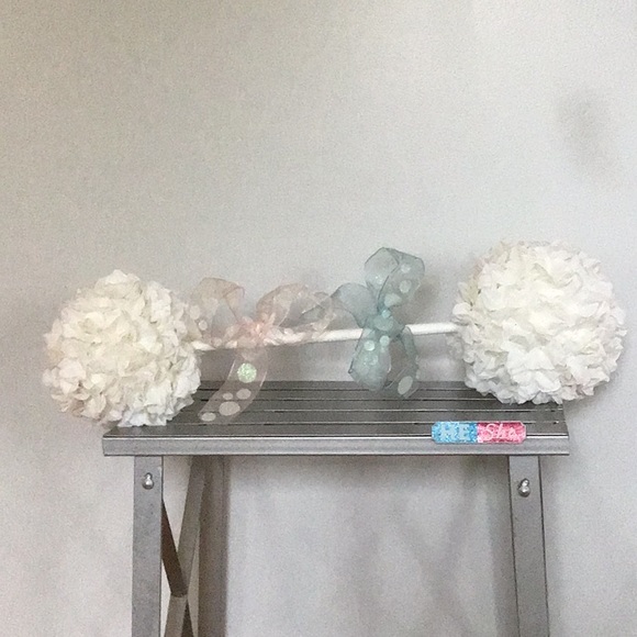 Custom decoration for gender reveal, baby shower or just to show your excitement🎊 white hydrangea buds form his adorable baby rattle with 💗pink/blue bows💙.
