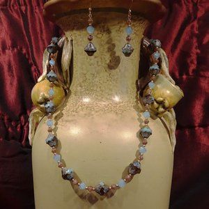 Aria Mediterranea - Handmade necklace/earring set with unique sky-blue & caramel colors reminiscent of a Mediterranean song. 18-inch necklace with 2-inch extender, earrings with hooks, posts, or leverbacks.
