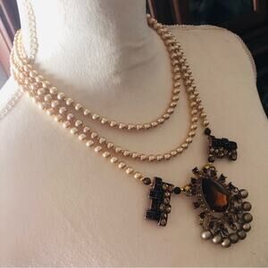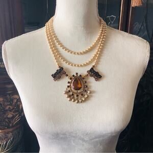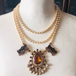 Handcrafted repurpose brown topaz gem Czech glass Pearl toggle clasp necklace, high quality Czech glass pearls, salvaged broken jewelry pieces used for the pendant creation, recycled spacers from vintage broken jewelry, glass/crystal and rhinestone accents, fancy toggle clasp set in gold plate, one of a kind elegant statement piece, 16” top strand, 20” bottom strand.