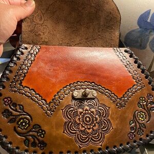 Last pic shows clean interior size: 10” wide x 7” tall x 3” depth, strap goes up to 27” long (adjustable)Unique brown leather crossbody bag with intricate floral designs. Features vibrant green and orange accents.