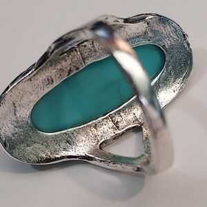 Handcrafted ring. Made with alloy and turquoise. The face of the ring measures 1.25 inch the stone itself is 1 inch. The band does have a few flaws which I tried to capture in the photos, but the band is smooth and will not scratch or poke you. Handcrafted.