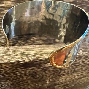 Handcrafted 2in Wide Cuff Bracelet, Malachite Green Stone, Mixed Metals, Adjust