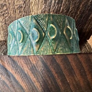 Elevate your accessory game with this stunning Handcrafted Artesian Boho Brass Patina Bracelet. Designed to captivate, this bracelet features an enchanting pattern of moons and diamonds set against a vibrant green background, making it a perfect statement piece.