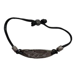 Crafted with attention to detail, this bracelet features a black leather cord and a sterling silver centerpiece with a detailed fish design.