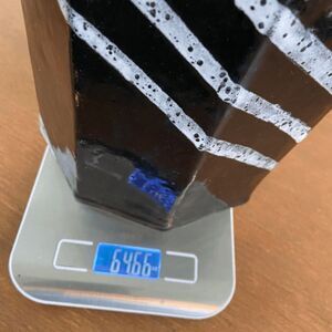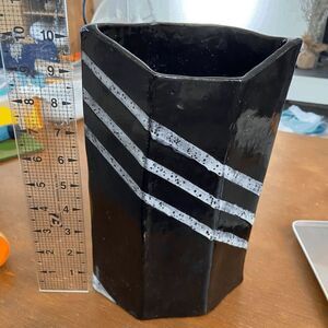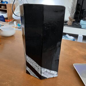 This unique hexagon-shaped ceramic vase is a handcrafted piece featuring a bold black glaze with diagonal white speckled stripes, giving it a striking modern and abstract look. Standing at approximately 10" tall and 6.5" wide, this vase is both functional and artistic. The sturdy construction and irregular handcrafted details add charm and character, making it a standout piece for any space. Signed "JL" on the base, this one-of-a-kind vase weighs over 4 lbs, ensuring a solid, durable design for years of display.