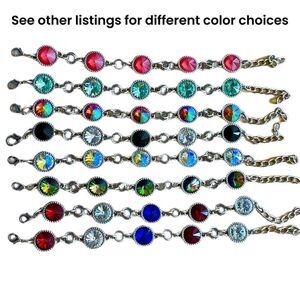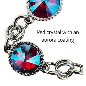 Beautiful statement bracelet with sparkly round red crystals in a rhodium plated silver tone bracelet. It is adjustable to fit most any wrist. The base part is almost 6” and with the extender it can go to 8.6” in length. I make jewelry using genuine Swarovski crystals. All items are new and much prettier in person than pictures. Proceeds used to help our 5-yr-old granddaughter Lila May in her fight against cancer, but she lost her battle. A percentage of profit will go to Neuroblastoma charities. B14