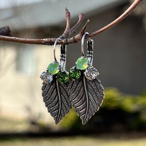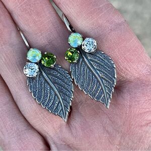 Brand-new, never worn Swarovski crystal earrings in a beautiful leaf style silver setting with green and clear crystals. My husband and I make jewelry using genuine Swarovski crystals. All items are new and much prettier in person than pictures. Proceeds used to help our 5-yr-old granddaughter Lila May in her fight against cancer, but she lost her battle. Now she is dancing with the angels. A percentage of profit will go to Neuroblastoma charities. 557