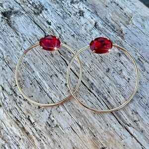 These are stud pierced earrings with a very large hoop and one oval Swarovski crystal. The crystals are a sparkly red shade. My husband and I make jewelry using genuine Swarovski crystals. All items are new and much prettier in person than in pictures. Proceeds used to help our five-year-old granddaughter Lila May in her fight against cancer, but she lost her battle. A percentage of profit will go to neuroblastoma charities. #441