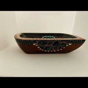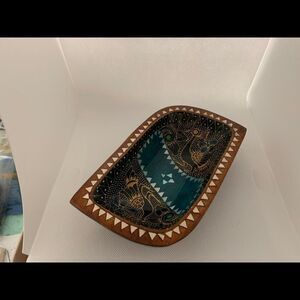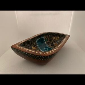 This gorgeous handcrafted dish was hand-painted and created by local artisans in South Africa. Rich Teel covers the outside with mother of pearl designs and hand painting measures 7” long 4” wide at the widest point and 1=1/2” deep. There’s also a listing with a brown finish if you will check my listings. 2 for $25