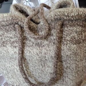 hand crafted, wool knit bag. round design with draw string straps. large cage appx 12x16x16".
