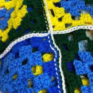 Handmade crocheted granny square baby Afghan 49” X 37”. Yellow, blue, green, and pink colors. Never used.