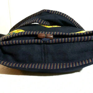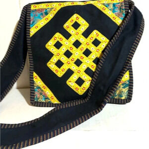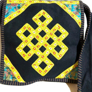 Handcuffed endless knots design embroidery messenger, crossbody handbag hight 11.5” wide 11” depth 2.5” strap drop 24”