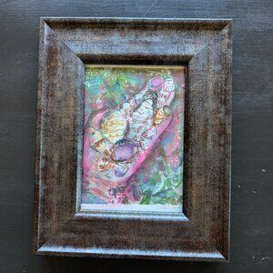 An impressionist interpretation of a handful of shells taken from the Pacific waters. The colors are largely green and pink with accents of blue, yellow, beige, and red orange. This original watercolor is ~5"x7" and set in this mottled red-brown preloved frame. Please allow for some minor signs of wear in the frame.