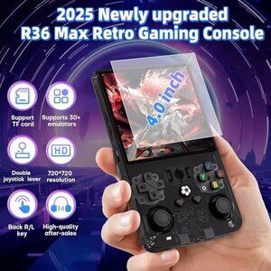 The Handheld Open Source Console R36 MAX in a solid YELLOW with a 4 inch screen is a portable gaming system with a sleek design. Comes with a protective case, screen protector and a charging cable. Device has a storage capacity of 128GB and 1 open expansion port (up to 256gb) for plenty of space to save your favorite game progress. There are 25 emulators and over 20,000 games. It features fast charging with USB-C and a resolution of 720p, providing an immersive gaming experience. The device is powered by a 4000mAh battery and has high speed USB-C connectivity for easy device charging. Manufactured in China, this handheld system is perfect for gamers looking for a versatile and compact gaming device.