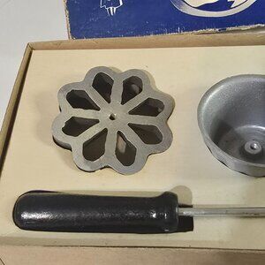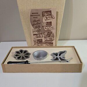 Handi Hostess Kit Waf-L-Ette and Patty Shell Molds Waffle Iron and Pastry Shells. This fun vintage kitchen tool kit from the 40s and 50s is from Bonley Industries of Chicago. This looks new. It is in the original box and has the original insert with instructions. The box does have some wear. The tool looks excellent without any wear.