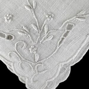 Handkerchief Vintage White Open Work Embroidered Floral Corners Scalloped Edging
