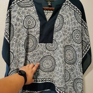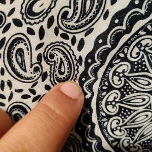 Navy blue handkerchief style blouse with paisley print. By Style & Co., Size S. There is one teeny tiny pink colored pen ink stain.