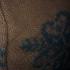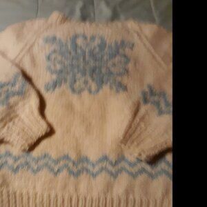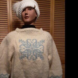 Handknit 100% Wool Sweater. This is a custom made Handknit sweater with knitted in Design and Snowflakes. Measurements are From back neck to bottom of sweater is 23" Sleeve length is 15" from underarm to wrist and Width, measured armpit to armpit is 19". It was made for my daughter and I'm sorry to say she never wore it, therefore, If I could put a sad 'Smiley Face" on this description I would. Beautiful warm wool sweater. 100% Knitted by Hand,