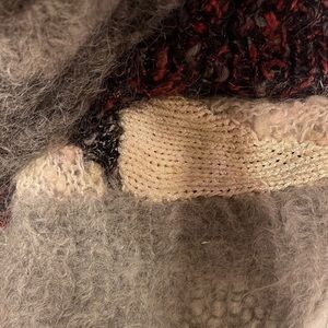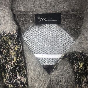 Very nice wool/blend long handknit cardigan by Marion with pockets and scarf. Please see last photo for very light stain on pocket threads. ** measurements upon request